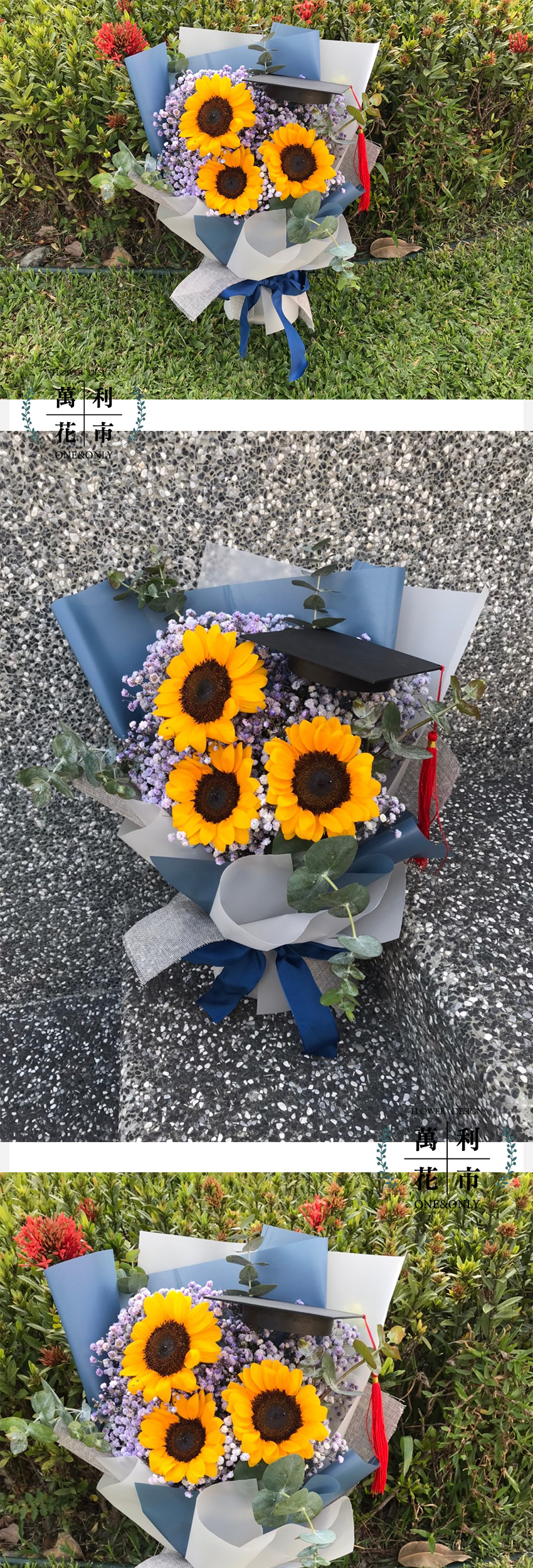 花材 : 向日葵3枝、滿天星3枝、尤加利5枝、學士帽1個