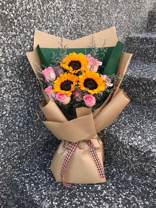 花材 : 向日葵3枝、粉玫瑰10枝、卡斯比亞1枝