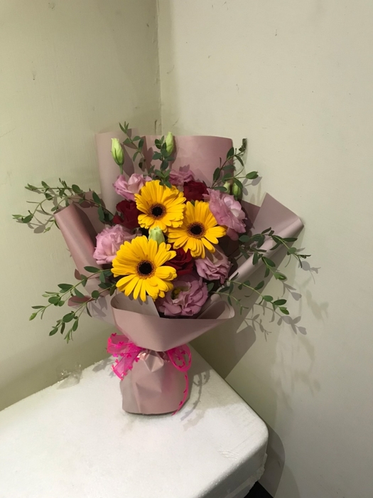 花材 : 黃太陽3枝、紅玫瑰3枝、粉桔梗3枝、細葉尤加利1枝