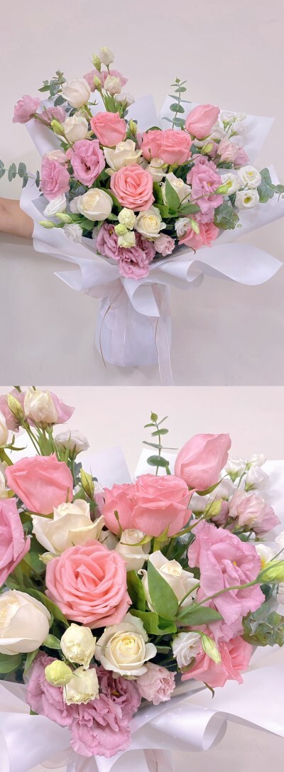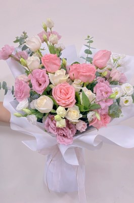 花材 :進口粉玫瑰、粉百合、粉桔梗、白桔梗、尤加利葉